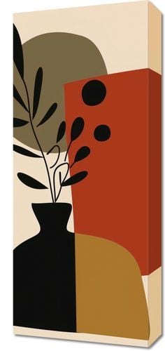 Obraz z serii minimalistyczne zatytułowany Dynamika Kompozycji. Ta grafika to esencja minimalistycznego piękna. Geometryczne formy wplecione w organiczny motyw roślinny tworzą spokojną, ale zarazem dynamiczną kompozycję. Proste linie i zrównoważone zestawienie kolorów – głębokiej czerni, ciepłego terrakoty, stonowanej zieleni i złota – nadają temu dziełu subtelny, ale wyrafinowany charakter. Dzieło idealnie wpisze się w nowoczesne, minimalistyczne lub śródziemnomorskie wnętrza, dostarczając delikatnego akcentu natury i abstrakcji.