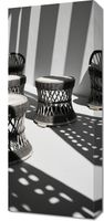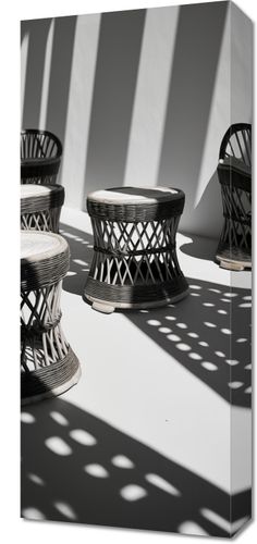 Obraz z serii wnętrza zatytułowany Gra Świateł to stylowa, monochromatyczna fotografia, która oddaje estetykę współczesnego designu. Na fotografii widzimy zestaw eleganckich, plecionych stołków z rattanu ustawionych na tle geometrycznych cieni. Ostre linie cieni przełamują okrągłe kształty mebli, tworząc fascynującą kompozycję pełną kontrastów. Białe siedziska stołków pięknie kontrastują z ciemniejszymi elementami, a gra światła i cienia nadaje scenie trójwymiarowość i teksturę. Obraz ten będzie doskonały dla miłośników minimalistycznych wnętrz, a także dla osób poszukujących elementu dekoracyjnego, który wprowadzi do pomieszczenia nowoczesny i artystyczny akcent. Idealny do nowoczesnych przestrzeni mieszkalnych, biur, kawiarni lub galerii sztuki.