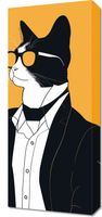 Obraz z serii abstrakcja zatytułowany Jegomość to stylizowany portret kota w ludzkim ubiorze. Charakterystyczne, czarno-białe ubarwienie kota zostało podkreślone przez elegancki, czarny garnitur z białą koszulą oraz modnymi, żółtymi okularami, które dodają postaci wyrafinowanego uroku. Tło w intensywnym odcieniu musztardy idealnie komponuje się z całością, nadając plakatowi ciepły i wyrazisty charakter. Silny profil kota, wyraźne linie i minimalistyczne podejście do szczegółów czynią ten obraz zarówno zabawnym, jak i eleganckim, idealnym do przestrzeni, które cenią sobie humor i styl, takich jak nowoczesne biura, domowe biblioteki czy saloniki.