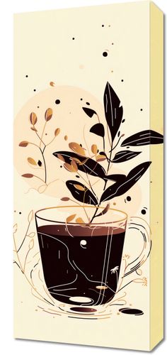 Obraz z serii minimalistyczne zatytułowany Jesienna Donica. Na obrazie widzimy czarną filiżankę pełną aromatycznej kawy, z której wyłania się roślinność w barwach jesieni. Tło w pastelowych beżach i brązach tworzy przytulną atmosferę, a drobne kropki i plamy nadają kompozycji dynamiki. Grafika oddaje ciepło i przytulność chłodniejszych dni, zapraszając do delektowania się chwilą w spokoju domowego zacisza. Idealny do wnętrz, które cenią sobie ciepłe akcenty i klimatyczne detale, pasuje do kawiarni, kuchni, lub jako element relaksującej przestrzeni w salonie.