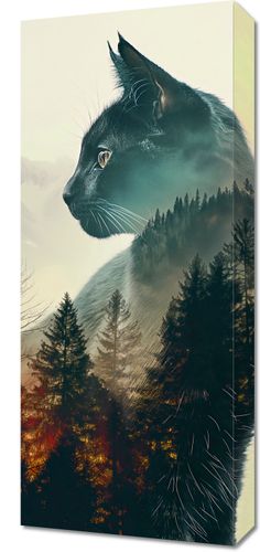 Obraz z serii natura zatytułowany Koci Duch Lasu. Ten obraz prezentuje zaskakującą kompozycję, w której sylwetka czarnego kota płynnie przechodzi w mglisty krajobraz leśny, łącząc świat zwierzęcia z dziką przyrodą. Złote i ciepłe odcienie jesiennego lasu w tle kontrastują z chłodnymi tonami gór, dodając głębi i tajemniczości. Mistyczne połączenie kota z naturą symbolizuje jedność i harmonię między żywymi istotami a otoczeniem, a także podkreśla dziką i niezależną naturę kota. Obraz idealnie nadaje się do przestrzeni mieszkalnych ceniących połączenie sztuki z naturą, takich jak nowoczesne salony, pokoje relaksacyjne lub gabinety, jak również może być inspirującym elementem dekoracyjnym dla gabinetów weterynaryjnych lub przychodni zoologicznych.