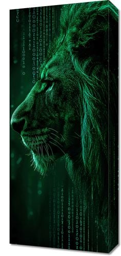 Obraz z serii pop art zatytułowany Kod Siły. Prezentuje majestatyczne oblicze lwa zanurzone w cyfrowym kodzie, który spływa w dół jak deszcz binarny, łącząc siłę i surowość natury z precyzją i logiką technologii. Zielonkawe światło podkreśla kontury i muskulaturę króla zwierząt, a cyfrowe elementy otulają jego profil, sugerując połączenie organicznego i syntetycznego świata. Ten obraz idealnie wpisuje się w nowoczesne, technologiczne przestrzenie, takie jak nowoczesne biura, pokoje gamingowe lub innowacyjne przestrzenie edukacyjne, oferując inspirację i refleksję nad współczesnym związkiem człowieka z technologią.