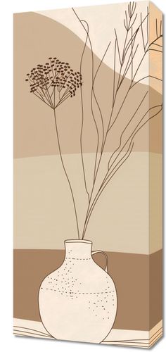 Obraz z serii minimalistyczne zatytułowany Kojący Wazon.Grafika z wprawą łączy subtelność natury z estetyką prostoty, przedstawiając bukiet suszonych roślin delikatnie umieszczonych w starannie wykonanym dzbanie. Dzieło gra na kontraście pomiędzy linearnym konturem a organicznymi kształtami, tworząc przy tym wizję pełną ciepła i spokoju. Tło w odcieniach beżu i brązu zapewnia kojący, zrównoważony nastrój, a całość kompozycji jest odzwierciedleniem natury uchwyconej w jej najprostszej formie. Obraz idealnie wpasuje się w wnętrza, gdzie dominuje spokój i naturalność, takie jak skandynawskie mieszkania, jasne gabinety czy przytulne zakątki do czytania. Jest to doskonały wybór dla tych, którzy pragną wprowadzić element natury do swojej przestrzeni bez jej dominacji, zachowując przy tym łagodny, neutralny ton.