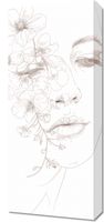 Obraz z serii wnętrza zatytułowany Kwitnąca Imersja przedstawia delikatny, linijny rysunek profilu kobiety, którego twarz częściowo zasłaniają i uzupełniają subtelne kwiaty. Delikatne linie twarzy kobiecej harmonizują z organicznymi kształtami roślin, sugerując jedność z naturą i subtelne piękno. Kwiaty wydają się być naturalnym przedłużeniem jej bytu, dodającym delikatności i eterycznego charakteru całej kompozycji. Ta minimalistyczna, ale wyrafinowana ilustracja emanuje spokojem i ukojeniem, idealna do przestrzeni medytacyjnych, salonów spa, lub jako elegancki element dekoracyjny w nowoczesnych wnętrzach.