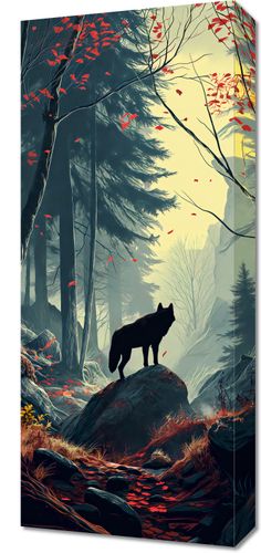 Obraz z serii natura zatytułowany Leśne Echa. Ilustracja przedstawia samotnego wilka stojącego na skale, który wpatruje się w mglistą dal tajemniczego lasu. Złote światło przebijające się przez drzewa nadaje scenie spokojną, ale zarazem majestatyczną atmosferę. Jesienne liście w odcieniach czerwieni kontrastują z chłodnymi tonami otoczenia, podkreślając zmienność sezonów. Obraz ten oddaje uczucie zadumy i połączenia z naturą, będąc idealnym dodatkiem do wnętrz, które cenią sobie spokój i dziką przyrodę, takich jak górskie chaty, saloniki z kominkiem lub przestrzenie wypoczynkowe.