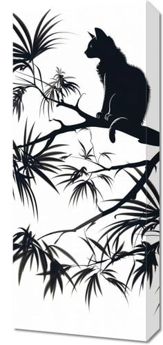 Obraz z serii wnętrza zatytułowany Na Gałęzi przedstawia sylwetkę kota siedzącego na gałęzi, zarysowaną na tle jasnego, jednolitego tła. Całość kompozycji utrzymana jest w stylu sumi-e, nawiązującym do tradycyjnej wschodniej techniki tuszem. Kontury kota i roślin są wyraziste, z delikatnymi szczegółami, które przywodzą na myśl efekt cieniowania i głębi. W tle roślinność, prawdopodobnie bambus lub tropikalne palmy, jest przedstawiona w sposób stonowany, co wskazuje na użycie gradientu cieni. Grafika ta oddaje spokój i harmonię, charakterystyczne dla azjatyckiej estetyki i sztuki. Idealnie nadawałaby się jako dekoracja w przestrzeniach inspirowanych minimalizmem i naturą.