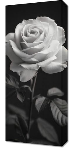 Obraz z serii wnętrza zatytułowany Płatki Róż. Obraz przedstawia ponadczasowy, monochromatyczny obraz róży. Róża, z delikatnymi i szczegółowymi płatkami, jest wyeksponowana na ciemnym tle, co wyostrza jej obrys i podkreśla subtelne niuanse jej formy. Gra światła i cienia nadaje głębi i trójwymiarowości, a ułożenie płatków w pełnym rozkwicie symbolizuje piękno i doskonałość. Liście i łodyga są skromne, ale wyraźne, dodając naturalności całej kompozycji. Obraz oddaje esencję delikatności i elegancji róży, co sprawia, że jest idealny dla każdego, kto szuka elementu dekoracyjnego o subtelnym pięknie i spokojnej, relaksującej estetyce.