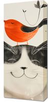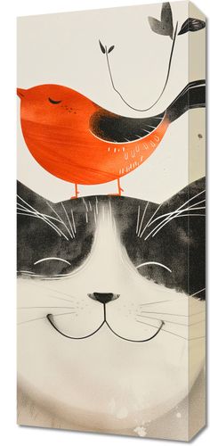Obraz z serii abstrakcja zatytułowany Pyzaty Przyjaciel przedstawia uroczą, minimalistyczną ilustrację czarno-białego kota z zamkniętymi oczami i szerokim uśmiechem, na którego głowie spoczywa radosny, czerwony ptaszek. Kot ma charakterystyczne białe obszary wokół pyszczka, na którym wyraźnie rysują się czarne wąsy i delikatny nos. Ptaszek wydaje się być zadowolony, śpiewający, z zamkniętymi oczkami, co dodaje kompozycji wesołego i spokojnego nastroju. Tło jest jasne, z subtelnymi plamami i kropkami, które mogą imitować subtelny efekt spękanego płótna lub papieru. Po lewej stronie, na górze, widoczna jest wschodnia pieczęć, co nadaje pracy szczyptę orientalnego charakteru. Ta grafika mogłaby być idealnym, ciepłym dodatkiem do przestrzeni domowej, zwłaszcza do pokoju dziecka lub jako element dekoracyjny w przestrzeni wspólnej, przynoszący uśmiech i poczucie spokoju.