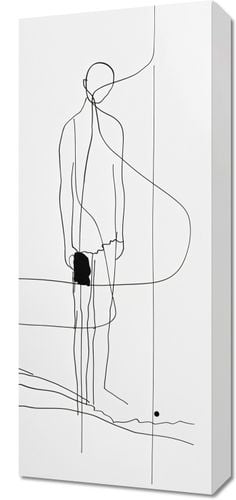 Obraz z serii minimalistyczne zatytułowany Samotna Wędrówka. Obraz przedstawia postać człowieka przedstawionego za pomocą zredukowanych linii, która wyraża elegancję i prostotę. Postać z dużym plecakiem jest uchwycona od tyłu, sugerując podróż lub długą wędrówkę. Linie przypominające krajobraz na dole obrazu i pojedynczy czarny punkt mogą symbolizować dalekie cele lub przemyślenia wędrowca. Ten minimalistyczny rysunek wprowadzi do wnętrza atmosferę refleksji i poszukiwania, będąc doskonałym wyborem do przestrzeni, które inspirują do myślenia i odkrywania, takich jak gabinety, studia czy nawet miejsca publiczne, gdzie sztuka ma za zadanie pobudzać do przemyśleń.