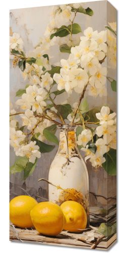 Obraz z serii wnętrza zatytułowany Słodkie Chwile. Delikatne białe kwiaty o subtelnym żółtym środku rozkwitają pełnym blaskiem obok dojrzewających cytryn, które wyróżniają się na tle w delikatnych pastelowych odcieniach. Starannie postarzana butelka i rustykalne drewno dodają nuty nostalgii i spokoju do tej kompozycji. Delikatna gra światła i cienia tworzy głęboką atmosferę i dodaje ciepła do sceny. Świetnie sprawdzi się w kawiarniach o prowansalskim stylu, domowych jadalniach dla tych, którzy pragną dodać do swojej przestrzeni odrobinę wiejskiego uroku, czy też w hotelach, gdzie chce się podkreślić elegancję i ciepło naturalnych elementów.