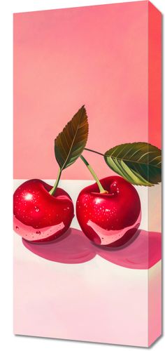Obraz z serii wnętrza zatytułowany Soczyste Oczywiste ukazuje dwa soczyste, lśniące wiśnie z dwoma zielonymi liśćmi, które są połączone w jedną gałązkę, na pastelowym różowym tle z białą powierzchnią, na której odbijają się owoce. Wiśnie są przedstawione w realistycznym stylu, z widocznymi refleksami światła i kroplami wody, co nadaje im świeży i apetyczny wygląd. Zastosowanie cieni i światłocienia nadaje kompozycji głębi i trójwymiarowości. Dominujące ciepłe odcienie różu i czerwieni tworzą przyjemną i słodką atmosferę. Obraz może być interpretowany jako celebracja lata i dojrzałych owoców lub jako minimalistyczne podejście do tematu natury morte w nowoczesnym wydaniu. Idealnie nadawałby się jako element dekoracyjny do kuchni lub jadalni, wprowadzając żywy i kolorowy akcent.