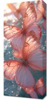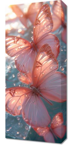 Obraz z serii natura zatytułowany Świetliste Motyle. Na obrazie widzimy delikatne motyle o przezroczystych, różowych skrzydłach, unoszące się nad wodą i łagodnie odbijające światło słoneczne. Kropelki wody na ich skrzydłach dodają uczucia świeżości i czystości. Obraz emanuje spokojem i pięknem, idealnie nadając się do przestrzeni, które chcą wprowadzić element relaksu i spokoju, takich jak spa, pokoje medytacyjne, a także jako łagodny element dekoracyjny do domu.