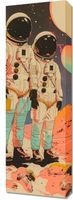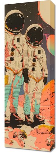 Obraz z serii pop art zatytułowany Astrounauci Kosmonauci przedstawia dwóch astronautów na powierzchni obcego ciała niebieskiego, prawdopodobnie księżyca lub planety. Tło jest pełne kosmicznych elementów, takich jak planetoidy, gwiazdy i dalekie galaktyki, które tworzą dynamiczne i kolorowe niebo. Astronauci są ubrani w tradycyjne skafandry kosmiczne z dużymi hełmami odblaskowymi, co dodaje im tajemniczości, ponieważ ich twarze pozostają niewidoczne. Scena emanuje poczuciem odkrywania i przygody, sugerując badanie i eksplorację kosmosu. W tle widać dwa duże ciała niebieskie, które mogą symbolizować inne planety lub księżyce, przy czym jedno z nich ma zauważalnie większe rozmiary i bardziej dominuje w kompozycji. Paleta kolorów jest bogata i odważna, z kontrastującymi ciepłymi i zimnymi odcieniami, co nadaje pracy żywotność i głębię. Obraz doskonale nadawałby się jako dekoracja dla miłośnika astronomii lub jako inspirujący element do pomieszczenia o tematyce naukowej lub technologicznej.