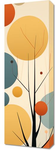 Obraz z serii wnętrza zatytułowany Harmonia Jesiennych Kolorów. Delikatne gałęzie drzewa, podkreślone przez cienie i linie, są otoczone przez okrągłe kształty w ciepłych, jesiennych odcieniach pomarańczy, żółci i niebieskiego. Kontrastujące kolory tworzą uczucie spokoju i równowagi, a jednocześnie dodają obrazowi głębi i dynamiki. Jego subtelny i elegancki design wzbogaca przestrzeń, dodając jej ciepła i przytulności. Idealnie pasuje do domowych salonów, kawiarni o spokojnym charakterze oraz przestrzeni relaksacyjnych, gdzie natura spotyka się z nowoczesnym designem.