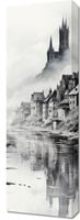 Obraz z serii pejzaże zatytułowany Mglisty Refleks. Misterne pociągnięcia pędzla przedstawiają starą wieś schowaną w mrocznych zakątkach gór, z dominującymi wieżami kościoła wznoszącymi się nad nią. Mgła otulająca krajobraz i odbicie w spokojnej wodzie tworzą atmosferę tajemniczości i zadumy. Monochromatyczna paleta barw dodaje głębi i intensywności całemu obrazowi, czyniąc go idealnym wyborem dla klasycznych salonów oraz miejsc takich jak kawiarnie o historycznym charakterze czy ekskluzywne kluby dyskusyjne.