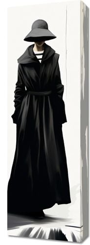 Obraz z serii wnętrza zatytułowany Mroczna Taina. Enigmatyczna postać w czarnym płaszczu i szerokim kapeluszu ukrywa swoją tożsamość, podkreślając aura tajemniczości. Czarno-białe tło z pionowymi smugami przypominającymi deszcz lub płynący atrament dodaje głębi i dramatyzmu kompozycji. Subtelne niuanse światła i cienia grają na powierzchni płaszcza, tworząc atmosferę intrygi i nieokreślonego niebezpieczeństwa. Świetnie sprawdzi się w nowoczesnych galeriach sztuki, luksusowych hotelach o minimalistycznym designie oraz w przestrzeniach przeznaczonych dla miłośników noir i kryminałów.