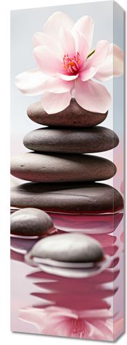 Obraz z serii natura zatytułowany Spokojne Odbicie. Delikatność różowego kwiatu doskonale kontrastuje z ciemnymi, gładkimi kamieniami, tworząc obraz pełen równowagi i spokoju. Lustro wody odbija symetrię kwiatu, podkreślając jego subtelność i kruchść, jednocześnie oddając uczucie głębi. Delikatne tło dodaje eteryczności i lekkości kompozycji. Ten relaksujący i wyciszający obraz doskonale sprawdzi się w spa, gabinetach masażu oraz w pomieszczeniach medytacyjnych, gdzie panować ma atmosfera spokoju i harmonii.