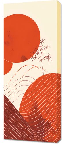Obraz z serii minimalistyczne zatytułowany Ciepło Czerwieni. Przedstawia on abstrakcyjny krajobraz, w którym dominują okrągłe formy w odcieniach ciepłej czerwieni, nawiązujące do zachodzącego słońca. Delikatna roślina, która wyrasta nad falującymi wzgórzami, wprowadza element natury i spokoju. Warstwowe linie w kształcie fal przedstawiają kształtujący się teren, dodając głębi i ruchu kompozycji. Ten obraz przywodzi na myśl spokój i majestatyczność końca dnia, jest idealny do umieszczenia w przestrzeniach, które celebrują naturalne piękno i proste momenty, takie jak salon, gabinet czy przestrzeń do medytacji.