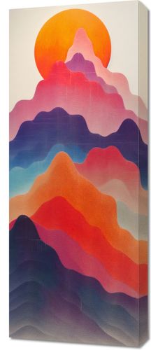 Obraz z serii abstrakcja zatytułowany Gama Gór to stylizowane przedstawienie majestatycznych gór, które tworzą warstwowe pasmo kolorów od głębokiego fioletu poprzez róż, czerwień, aż po ciepłe odcienie pomarańczu i żółci. Ta abstrakcyjna interpretacja krajobrazu górskiego z dużym, słońcem w odcieniach intensywnego pomarańcza w tle, nadaje dziełu atmosferę spokoju i medytacyjnej głębi. Delikatne tekstury i przejścia tonalne między warstwami nadają ilustracji poczucie trójwymiarowości i dynamiki. Obraz idealnie komponuje się z przestrzeniami, które cenią sobie naturę i spokój, nadając wnętrzom charakteru i głębi, doskonały do salonów, przestrzeni wellness, pokojów medytacyjnych lub jako akcent w nowoczesnych biurach.