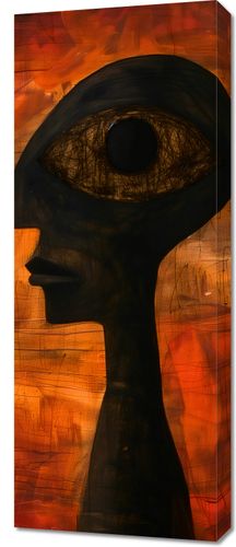 Obraz z serii abstrakcja zatytułowany Głęboki Wgląd przedstawia enigmatyczną sylwetkę o ludzkiej formie z dominującym, przeskalowanym okiem w miejscu głowy, wpatrującym się w widza z niezwykłą intensywnością. Tło obrazu jest abstrakcyjne, z bogatymi pociągnięciami pędzla w ciepłych odcieniach czerwieni i pomarańczy, sugerujące płomienne otoczenie lub burzliwe emocje. Sylwetka postaci jest zarysowana w głębokim czernią, co kontrastuje z jaskrawym tłem, a tekstura przypominająca sieć w obrębie oka może symbolizować skomplikowaną sieć ludzkich doświadczeń i percepcji. Dzieło to może wywoływać rozważania na temat ludzkiej świadomości i głębszego znaczenia bycia obserwatorem. Ten obraz będzie pasował do przestrzeni, które cenią głęboką myśl i filozoficzne dyskusje, takich jak biblioteki, studia artystyczne lub prywatne gabinety.