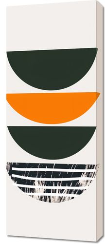 Obraz z serii boho zatytułowany Gra Tekstur to połączenie czystych, geometrycznych form z wyrazistą grą tekstur. Trzy półkoliste kształty w odcieniach głębokiej zieleni i żywej pomarańczy są ułożone w precyzyjny stos, tworząc zaskakującą głębię i zmysłową symetrię. Najniższa forma przerywa ten porządek, wprowadzając do dzieła dynamiczne, surowe detale, przypominające efekt artystycznego, spontanicznego malowania lub drapowania. Ten obraz jest idealnym wyborem dla wnętrz, które doceniają silne, graficzne elementy oraz surowy, industrialny klimat, pasując zarówno do minimalistycznych, jak i bardziej eklektycznych przestrzeni.