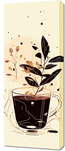 Obraz z serii minimalistyczne zatytułowany Jesienna Donica. Na obrazie widzimy czarną filiżankę pełną aromatycznej kawy, z której wyłania się roślinność w barwach jesieni. Tło w pastelowych beżach i brązach tworzy przytulną atmosferę, a drobne kropki i plamy nadają kompozycji dynamiki. Grafika oddaje ciepło i przytulność chłodniejszych dni, zapraszając do delektowania się chwilą w spokoju domowego zacisza. Idealny do wnętrz, które cenią sobie ciepłe akcenty i klimatyczne detale, pasuje do kawiarni, kuchni, lub jako element relaksującej przestrzeni w salonie.