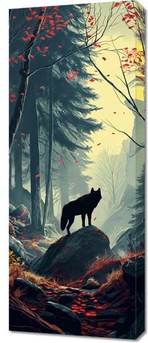 Obraz z serii natura zatytułowany Leśne Echa. Ilustracja przedstawia samotnego wilka stojącego na skale, który wpatruje się w mglistą dal tajemniczego lasu. Złote światło przebijające się przez drzewa nadaje scenie spokojną, ale zarazem majestatyczną atmosferę. Jesienne liście w odcieniach czerwieni kontrastują z chłodnymi tonami otoczenia, podkreślając zmienność sezonów. Obraz ten oddaje uczucie zadumy i połączenia z naturą, będąc idealnym dodatkiem do wnętrz, które cenią sobie spokój i dziką przyrodę, takich jak górskie chaty, saloniki z kominkiem lub przestrzenie wypoczynkowe.