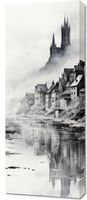 Obraz z serii pejzaże zatytułowany Mglisty Refleks. Misterne pociągnięcia pędzla przedstawiają starą wieś schowaną w mrocznych zakątkach gór, z dominującymi wieżami kościoła wznoszącymi się nad nią. Mgła otulająca krajobraz i odbicie w spokojnej wodzie tworzą atmosferę tajemniczości i zadumy. Monochromatyczna paleta barw dodaje głębi i intensywności całemu obrazowi, czyniąc go idealnym wyborem dla klasycznych salonów oraz miejsc takich jak kawiarnie o historycznym charakterze czy ekskluzywne kluby dyskusyjne.