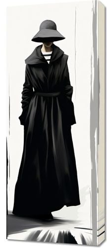Obraz z serii wnętrza zatytułowany Mroczna Taina. Enigmatyczna postać w czarnym płaszczu i szerokim kapeluszu ukrywa swoją tożsamość, podkreślając aura tajemniczości. Czarno-białe tło z pionowymi smugami przypominającymi deszcz lub płynący atrament dodaje głębi i dramatyzmu kompozycji. Subtelne niuanse światła i cienia grają na powierzchni płaszcza, tworząc atmosferę intrygi i nieokreślonego niebezpieczeństwa. Świetnie sprawdzi się w nowoczesnych galeriach sztuki, luksusowych hotelach o minimalistycznym designie oraz w przestrzeniach przeznaczonych dla miłośników noir i kryminałów.