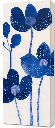 Obraz z serii wnętrza zatytułowany Nocne Kwiaty to odważne, graficzne przedstawienie kwiatów w monochromatycznej palecie kolorów granatowych. Kwiaty o stylizowanych formach i różnorodnych fakturach wyłaniają się na tle w delikatnym odcieniu, co dodaje kompozycji spokojnego, ale zarazem wyrazistego charakteru. Sploty i kropki na płatkach kwiatów tworzą iluzję głębi i tekstury, a ich symetryczny rozmieszczenie nadaje plakatowi rytmicznej harmonii. Ten obraz jest wyrafinowany i współczesny, idealny dla przestrzeni szukających minimalistycznej, ale odważnej dekoracji ściennych, takich jak nowoczesne biura, eleganckie salony czy jako wyjątkowy element w galeriach sztuki.