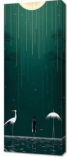 Obraz z serii wnętrza zatytułowany Nocne Marzenia. Scena przedstawia tajemniczą postać mężczyzny stojącego obok białej czapli, obaj są zanurzeni w wodzie i skierowani ku jasnoświecącemu księżycowi. Delikatne krople deszczu spadają z nieba, tworząc subtelną melodię natury, podczas gdy zarysy drzew rzucają cienie na monochromatyczne tło. Biały parasol unoszący się nad wodą dodaje elementu nieoczekiwanej magii i tajemniczości. Ta głęboka i metaforyczna kompozycja idealnie pasuje do nowoczesnych galerii sztuki, medytacyjnych przestrzeni oraz salonów czytania, gdzie cisza i kontemplacja dominują nad zgiełkiem codzienności.