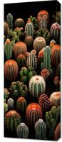Obraz z serii natura zatytułowany Ogród Kaktusów. Prezentuje on bogatą kolekcję kaktusów w różnych odcieniach zieleni, czerwieni i pomarańczy, które wyłaniają się z głębi czarnego tła, nadając kompozycji głębi i intensywności. Różnorodność kształtów i faktur roślin w połączeniu z ich naturalnymi barwami tworzy wizualną ucztę, podkreślającą piękno i różnorodność tych wytrzymałych roślin. Obraz ten jest idealnym dodatkiem do wnętrz o tematyce przyrodniczej, takich jak oranżerie, pokoje wypoczynkowe, czy współczesne przestrzenie biurowe, wprowadzając element organiczny i żywy do każdego otoczenia. To także wspaniała inspiracja dla miłośników sukulenty i pustynnej flory.