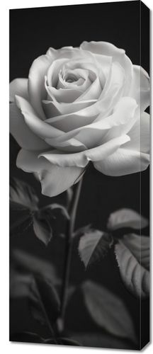 Obraz z serii wnętrza zatytułowany Płatki Róż. Obraz przedstawia ponadczasowy, monochromatyczny obraz róży. Róża, z delikatnymi i szczegółowymi płatkami, jest wyeksponowana na ciemnym tle, co wyostrza jej obrys i podkreśla subtelne niuanse jej formy. Gra światła i cienia nadaje głębi i trójwymiarowości, a ułożenie płatków w pełnym rozkwicie symbolizuje piękno i doskonałość. Liście i łodyga są skromne, ale wyraźne, dodając naturalności całej kompozycji. Obraz oddaje esencję delikatności i elegancji róży, co sprawia, że jest idealny dla każdego, kto szuka elementu dekoracyjnego o subtelnym pięknie i spokojnej, relaksującej estetyce.