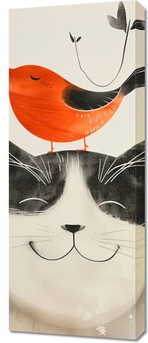 Obraz z serii abstrakcja zatytułowany Pyzaty Przyjaciel przedstawia uroczą, minimalistyczną ilustrację czarno-białego kota z zamkniętymi oczami i szerokim uśmiechem, na którego głowie spoczywa radosny, czerwony ptaszek. Kot ma charakterystyczne białe obszary wokół pyszczka, na którym wyraźnie rysują się czarne wąsy i delikatny nos. Ptaszek wydaje się być zadowolony, śpiewający, z zamkniętymi oczkami, co dodaje kompozycji wesołego i spokojnego nastroju. Tło jest jasne, z subtelnymi plamami i kropkami, które mogą imitować subtelny efekt spękanego płótna lub papieru. Po lewej stronie, na górze, widoczna jest wschodnia pieczęć, co nadaje pracy szczyptę orientalnego charakteru. Ta grafika mogłaby być idealnym, ciepłym dodatkiem do przestrzeni domowej, zwłaszcza do pokoju dziecka lub jako element dekoracyjny w przestrzeni wspólnej, przynoszący uśmiech i poczucie spokoju.