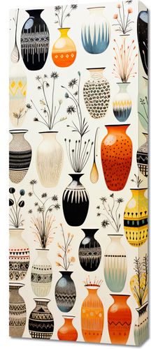 Obraz z serii wnętrza zatytułowany Symfonia Wazonów. Wspaniałe wazony w bogatej palecie kolorów, od głębokiej czerni do ciepłych odcieni pomarańczu, tworzą intrygującą mozaikę wzorów i kształtów. Delikatne motywy roślinne, które zdobią niektóre wazony, dodają uroku i lekkości, a różnorodność wzorów i faktur przyciąga wzrok i zaprasza do głębszej refleksji. Kontrast między jasnymi i ciemnymi barwami, a także subtelne niuanse w każdym wazonie, dodają tej kompozycji głębi i dramatu. Ten artystyczny plakat doskonale wpisuje się w klimat wyrafinowanych galerii sztuki, eleganckich kawiarni oraz nowoczesnych przestrzeni mieszkalnych, które stawiają na unikatowy design.