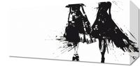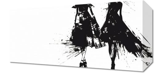 Obraz z serii wnętrza zatytułowany Atramentowy Przerys. Plakat ukazuje dwie stylizowane postacie kobiet w dynamicznej pozie, co nadaje wrażenie ruchu i elegancji. Obraz jest utrzymany w monochromatycznej palety kolorystycznej, gdzie silne kontrasty czerni i bieli tworzą dramatyczny efekt. Postaci są zredukowane do esencjonalnych form i plam atramentu, co przypomina szkice mody z charakterystycznym dla tego gatunku użyciem cienia i światła do zarysowania konturów odzieży i ciała. Energetyczne smugi i plamy atramentu sprawiają, że suknie wydają się falować i poruszać, a zarysowane w sposób abstrakcyjny obcasy dodają całej kompozycji współczesnego wyrazu. Ten obraz mógłby być wspaniałym dodatkiem do przestrzeni o nowoczesnym, artystycznym charakterze, takich jak atelier, modowe salony czy współczesne galerie.