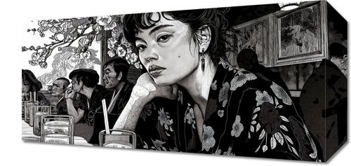 Obraz z serii motywy wschodnie zatytułowany Czarne Kimono. Przedstawia on czarno-białą scenę w restauracji, w której centralną postacią jest młoda kobieta o intensywnym spojrzeniu, ubrana w tradycyjny, kwiecisty kimono. Jej postać wyróżnia się na tle pozostałych gości, a szczegółowa grafika podkreśla wyraźne detale jej stroju i delikatnych rysów twarzy. Tło, zdobione motywem kwiatowym, nadaje głębi i kontekstu kulturowego, a całość kompozycji wywołuje atmosferę introspekcji i spokoju. Ten obraz idealnie nadaje się do wnętrz, które chcą oddać hołd klasycznej estetyce Dalekiego Wschodu lub po prostu wprowadzić element zastanowienia i piękna. Doskonale wpasuje się w przestrzenie takie jak salon, gabinet, a nawet miejsca publiczne, które pragną zapewnić swoim gościom wizualny odpoczynek i chwilę zadumy.