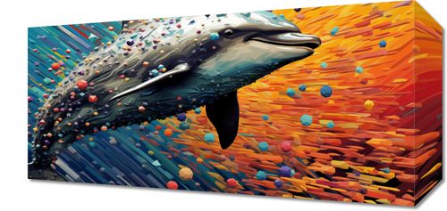 Obraz z serii pop art zatytułowany Delfin w Palecie Barw. Obraz prezentuje radosnego delfina wyskakującego z wody, z dynamicznie kolorowym tłem, które tworzy efekt rozpryskujących się kropli wodnych. Tło składa się z żywych pociągnięć pędzla w ciepłych odcieniach żółci, pomarańczy i chłodnych błękitów, co nadaje kompozycji wrażenie ruchu i witalności. Delfin jest oddany z dużym realizmem, z uwypukleniem szczegółów jego uśmiechniętej twarzy i skóry, natomiast abstrakcyjne, kolorowe kształty otaczające zwierzę nadają dziełu charakteru współczesnego dzieła sztuki. Obraz ten jest pełen pozytywnej energii i mógłby być pięknym, inspirującym dodatkiem do każdego środowiska, szczególnie tam, gdzie chciano by podkreślić miłość do oceanu, natury lub sztuki współczesnej.