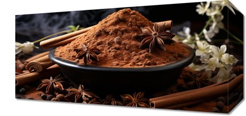 Obraz z serii święta zatytułowany Esencja Aromatu. Mocny akcent na kompozycję przypraw z cynamonem, anyżem i ziarnami pieprzu rozsypanych wokół miski pełnej mielonego cynamonu, tworzący wzór przypominający sztukę natury, wyróżnia się zarówno prostotą, jak i głębią. Delikatny dym unoszący się nad przyprawami dodaje atmosfery ciepła i domowego ogniska. Ten obraz idealnie komponuje się z kuchniami o bogatym, ziemskim wystroju, jak również z eleganckimi restauracjami oferującymi etniczną kuchnię, gdzie podkreśli uczucie przytulności i tradycji.