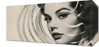 Obraz z serii pop art zatytułowany Ikonka Kina. Przedstawia czarno-białe portretowe zdjęcie klasycznej gwiazdy filmowej, której twarz jest częściowo zakryta przez geometryczny wzór spiralnych linii. Linie te dodają obrazowi dynamiki i nowoczesnego akcentu, kontrastując z retro estetyką portretu. Ten obraz łączy stare z nowym, sugerując zarówno ponadczasową piękność, jak i współczesne spojrzenie na sztukę. Idealny do eleganckich, miejskich przestrzeni lub jako dekoracja dla miłośników klasycznego kina.
