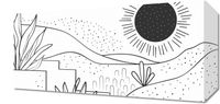Obraz z serii minimalistyczne zatytułowany Linearny Pejzaż. Obraz przedstawia liniową ilustrację krajobrazu w czerni i bieli, gdzie przestrzeń zapełniają delikatne linie, kropki i abstrakcyjne formy roślinności. Centralnym punktem jest stylizowane słońce z promieniami rozchodzącymi się we wszystkie strony, towarzyszy mu mniejsze ciało niebieskie, które może symbolizować planetę lub księżyc. Lekkie kropki sugerują obecność piasku lub gwiazd, dodając elementu fantazji. Ten obraz wprowadzi do każdej przestrzeni element spokoju i prostoty. Idealnie nadaje się do nowoczesnych przestrzeni, takich jak minimalistyczne biura, jadalnie czy pokoje młodzieżowe, dostarczając neutralnej palety, która pasuje do wielu schematów kolorystycznych i stylów dekoracyjnych.