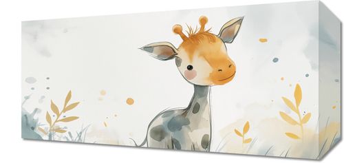 Obraz z serii wnętrza zatytułowany Mała Żyrafka. Uroczy obraz przedstawia młodą żyrafę o łagodnym spojrzeniu, wyłaniającą się z akwarelowej mgły pastelowych barw. Delikatne krople farby i subtelne linie tworzą atmosferę czystości i spokoju, nadając dziełu ciepły i relaksujący nastrój. Ten obraz, emanujący dziecięcą niewinnością i ciekawością świata, będzie idealnym dodatkiem do przestrzeni dziecięcej, takiej jak pokoje maluchów, przedszkola lub miejsca oczekiwania w placówkach pediatrycznych, zachęcając małych i dużych do marzeń i odkrywania piękna przyrody.