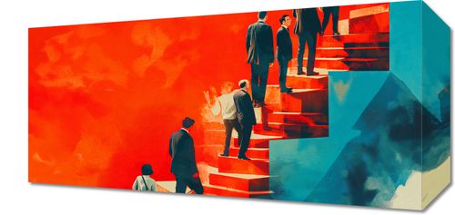 Obraz z serii abstrakcja zatytułowany Metafory Sukcesu. Przedstawia on różne postacie w formalnym ubiorze, wchodzące i schodzące po schodach, które rozdzielają się i zbiegają w różnych kierunkach. Tło obrazu jest podzielone na dwie kontrastujące strony - jedna w odcieniach czerwieni, a druga w chłodnych błękitach, symbolizując różne ścieżki i wybory w życiu zawodowym lub osobistym. Styl graficzny łączy elementy abstrakcyjne i figuralne, a silne kontrasty kolorystyczne podkreślają dynamikę i złożoność podejmowanych decyzji. Obraz ten mógłby być inspirującym dodatkiem do biura lub przestrzeni pracy, zachęcającym do refleksji nad własnym rozwojem i aspiracjami.