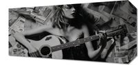 Obraz z serii pop art zatytułowany Młoda Gitarzystka. Portretuje młodą, energiczną gitarzystkę, zanurzoną w muzyce, otoczoną przez rozrzucone gazety. W monochromatycznej palecie szarości, uchwycono moment twórczego uniesienia artystki, jej pasję i pochłonięcie sztuką. W tle obrazu, strzępy artykułów i notatek muzycznych dodają głębi i kontekstu, sugerując bogatą historię i inspiracje. Obraz idealnie nadaje się do wnętrz vintage, studiów muzycznych, jak również jako inspirujący element w pokojach młodych twórców i wszędzie tam, gdzie chcemy podkreślić miłość do muzyki i jej uniwersalne przesłanie.