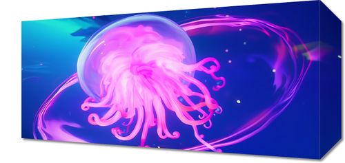 Obraz z serii natura zatytułowany Neonowa Meduza. Na tej hipnotyzującej grafice przedstawiona jest meduza o fluorescencyjnych, różowych odcieniach, unosząca się w głębinach morskich o niebieskich i purpurowych barwach. Jej delikatne, taneczne macki rozwijają się elegancko w wodnym środowisku, które tętni życiem dzięki dynamicznym zakrzywieniom i świetlistym akcentom. Scena emanuje spokojem i tajemniczością głębin oceanu, a jednocześnie wibruje energetycznym blaskiem meduzy. Ten obraz jest celebracją bioluminescencji i złożoności morskiego życia, idealny dla przestrzeni, które chcą wprowadzić elementy zjawiskowej natury i głębokiego wglądu w nieodkryte tajemnice oceanu.
