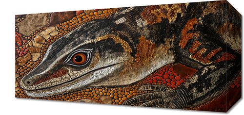 Obraz z serii abstrakcja zatytułowany Oko Jaszczurki. Fascynujące dzieło sztuki przedstawia zbliżenie na oko jaszczurki, które jest wykonane z niezwykłą dbałością o detale. Bogata faktura skóry zwierzęcia oraz użycie techniki przypominającej pointylizm sprawiają, że obraz zyskuje trójwymiarową głębię i realizm. Dynamiczna paleta barw, od głębokich odcieni brązu po złote i pomarańczowe akcenty, podkreśla dziką i pierwotną esencję natury. Obraz ten idealnie wpasuje się w dekoracje wnętrz o tematyce przyrodniczej, jak również stanowić może wyrazisty element w przestrzeniach edukacyjnych, takich jak sale biologiczne czy przyrodnicze, a także jako elegancki akcent w przestrzeniach mieszkalnych dla miłośników natury i dzikiej fauny.