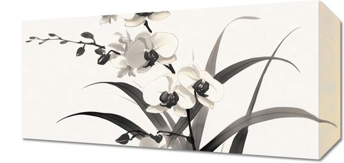 Obraz z serii wnętrza zatytułowany Orchidea. Na obraz widoczna jest stylizowana kompozycja kwiatów orchidei, przedstawiona w monochromatycznej kolorystyce. Dominują odcienie bieli i czerni, które tworzą silny kontrast, podkreślający delikatne kształty i szczegóły płatków oraz ciemniejsze środki kwiatów. Liście i łodygi są przedstawione w odcieniach szarości, co dodaje głębi i tekstury do obrazu. Całość kompozycji jest elegancka i nowoczesna, z subtelnymi gradientami i cieniowaniem dla realizmu. Tło jest jasne, co sprawia, że kwiaty wydają się jeszcze bardziej wyraziste. Ten obraz może być interpretowany jako połączenie naturalnego piękna z minimalistyczną estetyką, idealne do nowoczesnych wnętrz, które cenią sobie prostotę i elegancję.