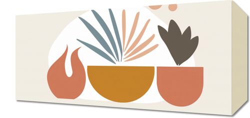 Obraz z serii boho zatytułowany Paleta Roślinna.Ten obraz łączy geometryczną prostotę z motywami roślinnymi, tworząc czystą i nowoczesną interpretację natury. Stonowana kolorystyka z akcentami pastelowych barw wprawia w stan relaksu i spokoju. Motywy roślinne, stylizowane na abstrakcyjne kształty, wyłaniają się z prostokątnych doniczek, tworząc harmonijną całość. Jest to idealny wybór dla tych, którzy cenią sobie spokój i przytulność w swoim domowym zaciszu. Obraz będzie pasował do przestrzeni życiowej urządzonej w duchu skandynawskim lub minimalistycznym, gdzie prostota formy idzie w parze z naturalnym pięknem. Może ozdobić ściany w salonach, sypialniach lub biurach, gdzie wprowadzi odrobinę naturalnej estetyki bez przytłaczania przestrzeni.