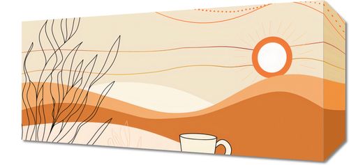 Obraz z serii minimalistyczne zatytułowany Ranna Pora. Obraz przedstawia stylizowany, spokojny krajobraz pustynny z wschodzącym słońcem, które emanuje ciepłem, barwiąc niebo w pastelowe odcienie. Ponad łagodnymi, falującymi wzgórzami widnieją delikatne linie, które mogą przypominać ciepłe prądy powietrza lub subtelne ozdoby. Na pierwszym planie znajduje się filiżanka kawy, umieszczona tak, jakby była częścią pustynnego terenu, co dodaje scenie element codziennego rytuału i spokoju. Obraz jest pełen ciepłych, ziemiście beżowych i pomarańczowych odcieni, które wprowadzają atmosferę relaksu i spokoju. Idealnie pasuje do przestrzeni wypoczynkowych, takich jak kawiarnie, salony, czy pokoje do odpoczynku, gdzie może pomóc stworzyć przytulne i spokojne otoczenie. Dzieło to z pewnością będzie przyciągać wzrok, będąc subtelny jednocześnie.