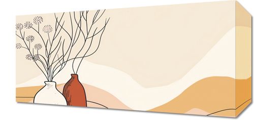 Obraz z serii minimalistyczne zatytułowany Stylowe Beże. Obraz przedstawia uproszczoną, elegancką kompozycję waz z suszonymi roślinami na tle delikatnych, pustynnych wzgórz. Wazony o prostych formach i kontrastowych kolorach - jeden biały, drugi w odcieniu ciepłej cegły - stoją przed zmiennym tłem beżów i brązów. Rośliny zostały przedstawione za pomocą czarnych, finezyjnych linii, które dają iluzję delikatności i subtelności. Obraz z łatwością wpasuje się w różne wnętrza dzięki swojej neutralnej palecie kolorów i prostocie form. Będzie doskonałym wyborem do pomieszczeń urządzonych w stylu skandynawskim, boho, a także w nowoczesnych przestrzeniach biurowych. Zapewnia ciepło i wyrafinowanie, a jednocześnie nie przytłacza przestrzeni.